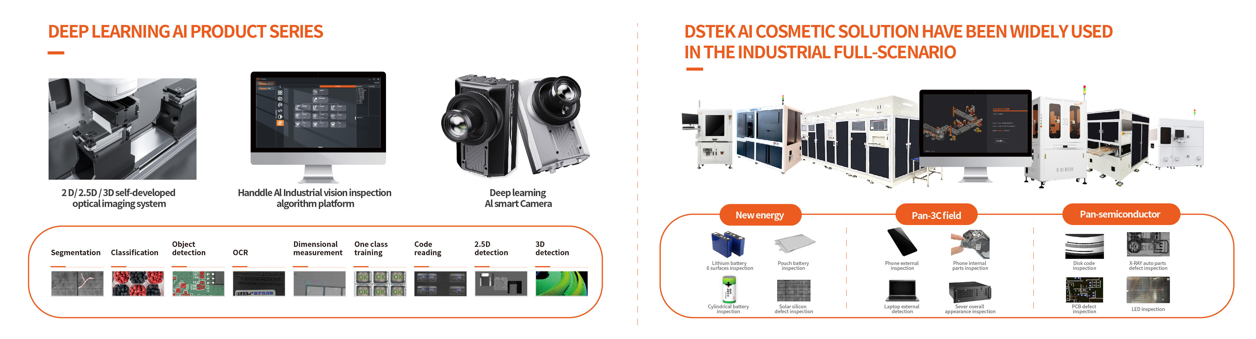 As a leader in AI industrial vision, DSTEK 's research and development team focuses on the deep cultivation of AI machine vision, dedicated to new research and development, new technologies, and new applications. They have accumulated rich project implementation experience, and rely on self-developed standardized AI software and hardware products and self-developed optical imaging solutions to occupy a good market share. They have achieved particularly significant results in fields such as pan 3C, new energy lithium batteries, and pan semiconductors.