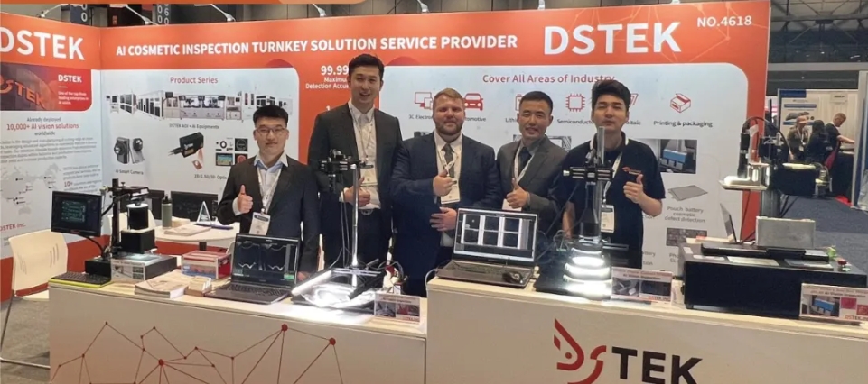 At the exhibition, DSTEK specially displayed the AI visual inspection scheme of the mobile phone rear camera, the automobile adhesive AI visual inspection scheme, the lithium battery 2D/3D seal nail welding AI visual inspection scheme, and the PCBA AI visual inspection scheme.