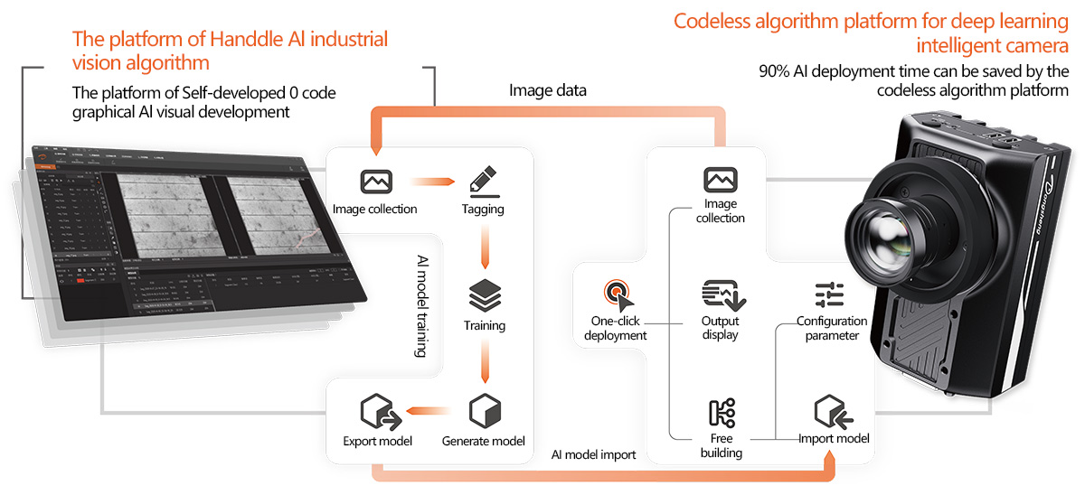 The deep learning intelligent camera created by DSTEK is a highly integrated micro machine vision system, with an integrated structure that is flexible and easy to deploy. The camera perfectly matches with the platform of Handdle Al algorithm and supports the import of Al models, which saves 90% of Al deployment time and effectively solves complex scenario problems in various industrial fields.